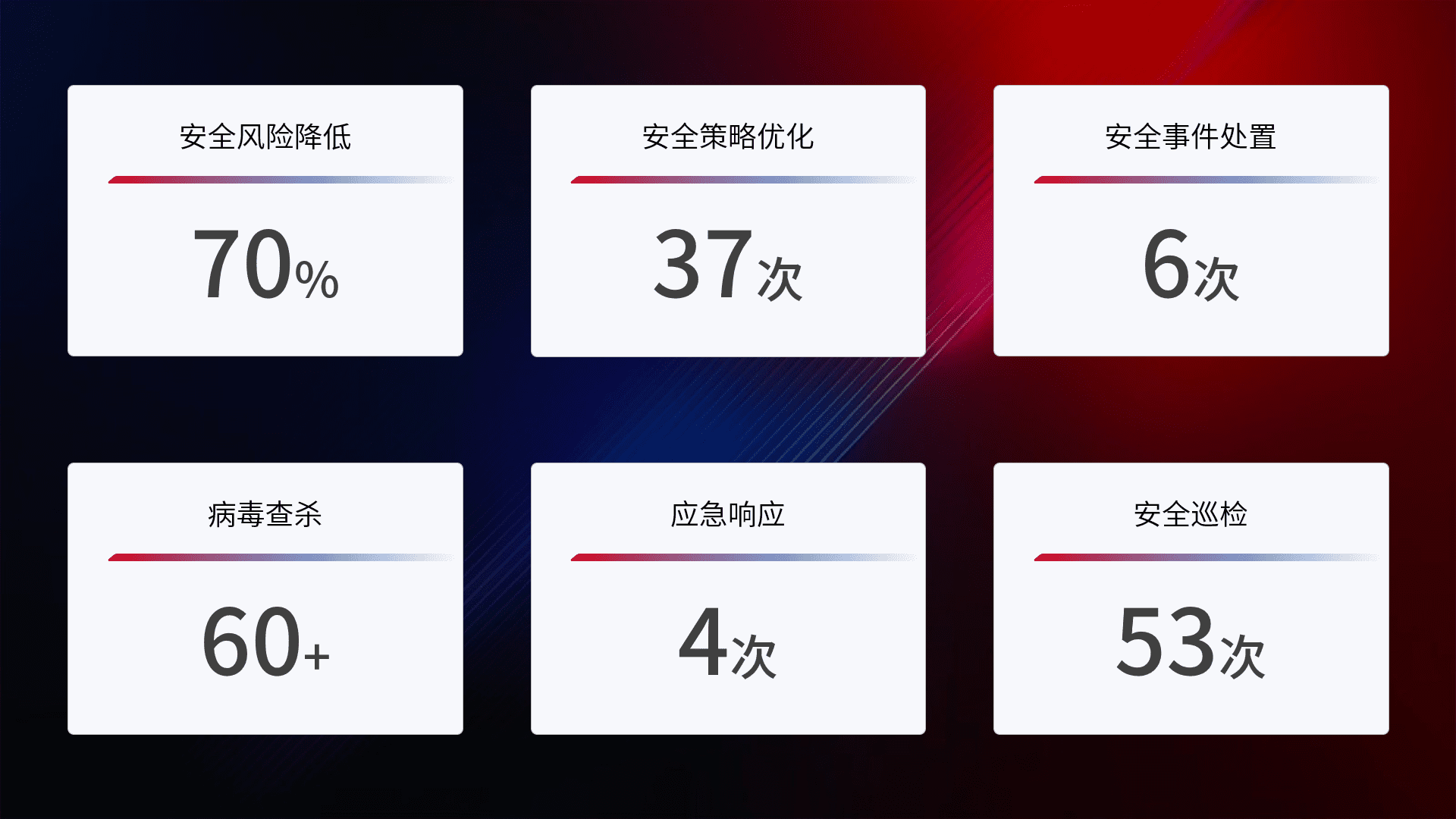 提供全面的安全事件报告体系,,包括处置报告、、、、周报、、、季度和年度总结,,结合持续监控,,,帮助客户深入了解网络安全状况。。。。